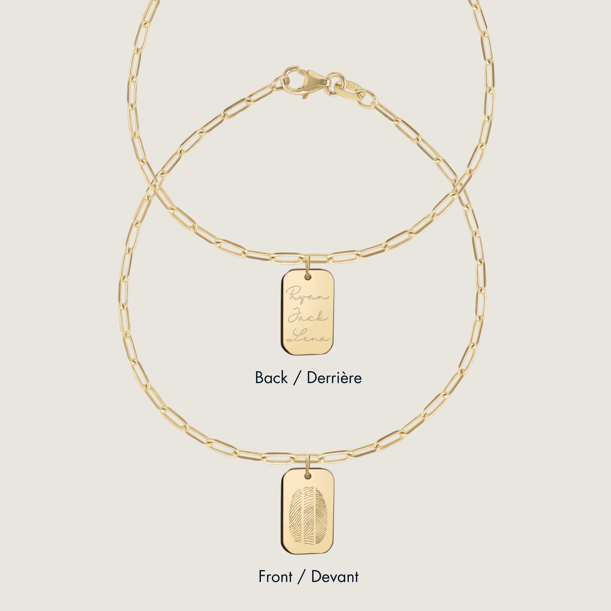 Le Bracelet à Trois Empreintes Personnalisé est conçu en or massif 10K sous la forme d’un rectangle élégant qui brille d’un éclat riche et luxueux. Son design épuré s’associe parfaitement avec une chaîne fine et délicate. Fabriqué en or massif, ce bracelet est conçu pour être porté au quotidien—que vous optiez pour une tenue habillée ou décontractée, il s’adapte à tous les styles.