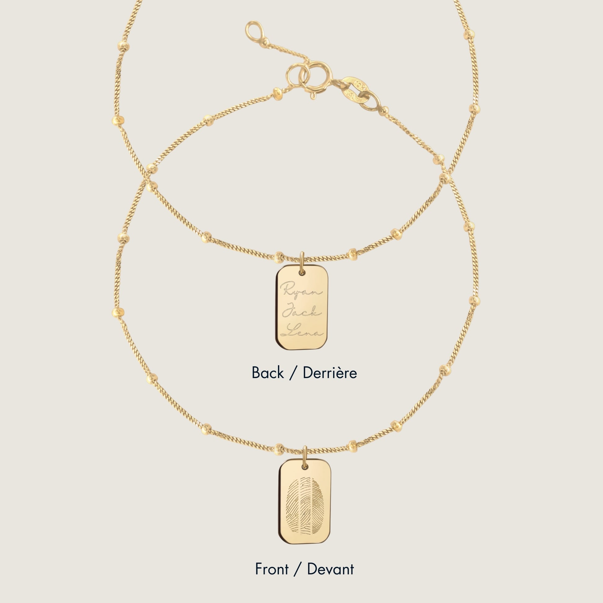 Le Bracelet à Trois Empreintes Personnalisé est conçu en or massif 10K sous la forme d’un rectangle élégant qui brille d’un éclat riche et luxueux. Son design épuré s’associe parfaitement avec une chaîne fine et délicate. Fabriqué en or massif, ce bracelet est conçu pour être porté au quotidien—que vous optiez pour une tenue habillée ou décontractée, il s’adapte à tous les styles.