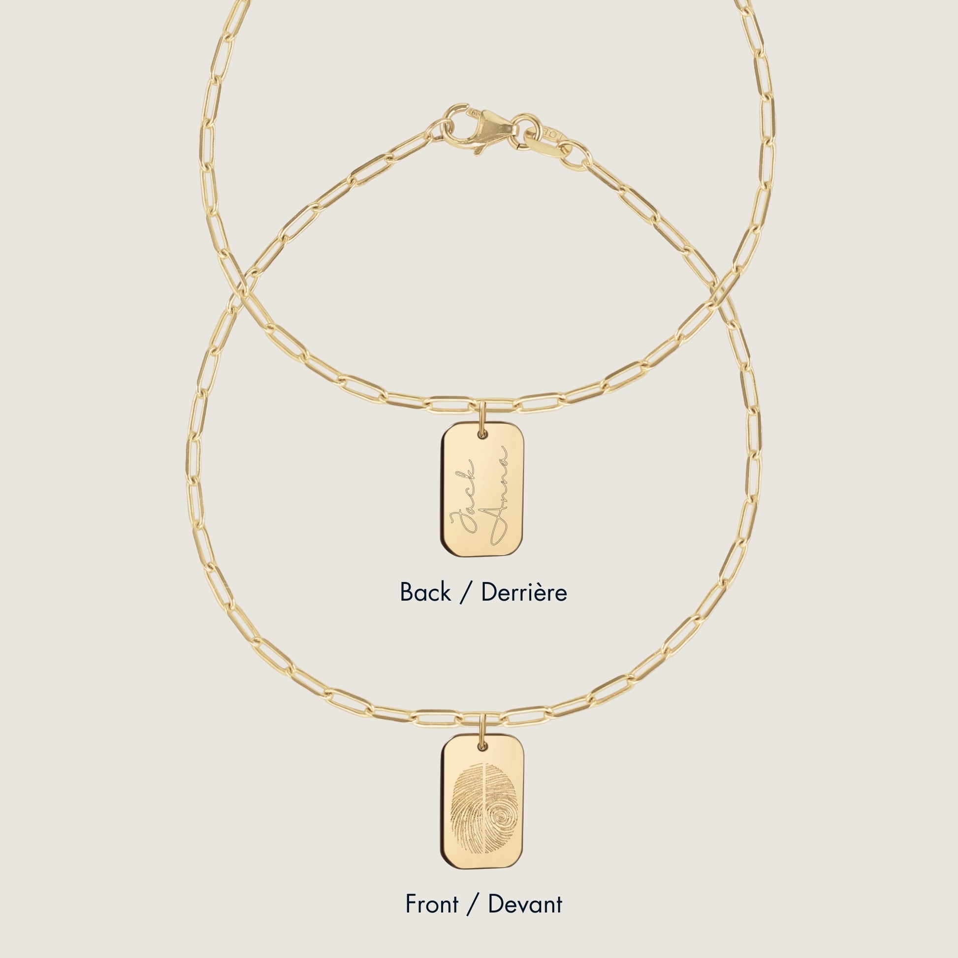 Le Bracelet Empreinte Personnalisé est conçu en or massif 10K sous la forme d’un rectangle élégant qui brille d’un éclat riche et luxueux. Son design épuré s’associe parfaitement avec une chaîne fine et délicate. Fabriqué en or massif, ce pendentif est conçu pour être porté au quotidien—que vous optiez pour une tenue habillée ou décontractée, il s’adapte à tous les styles.