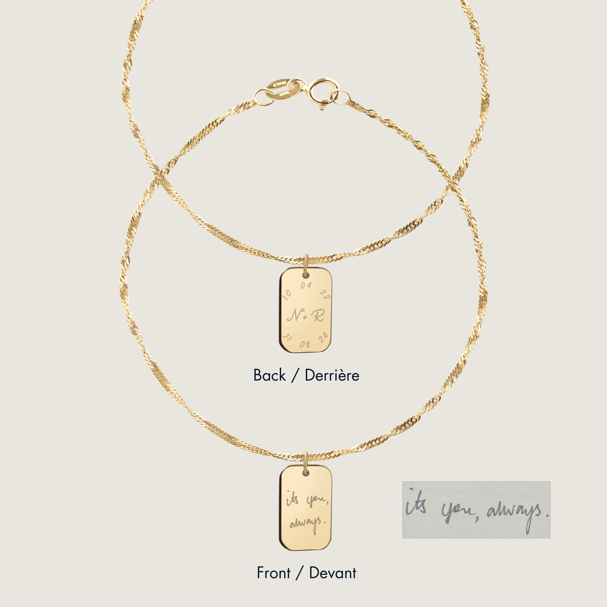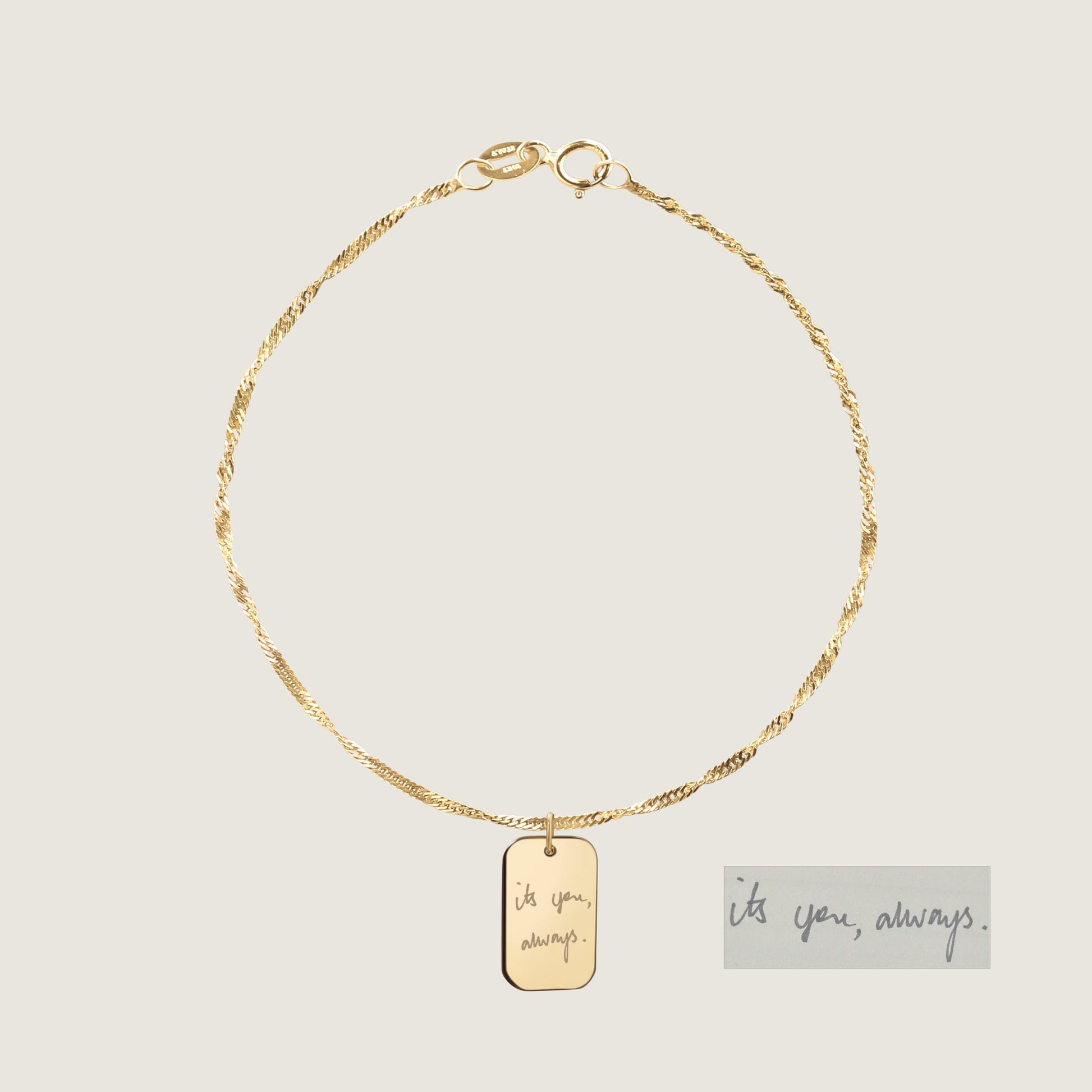 The Custom Handwriting Bracelet features a stunning 10K solid gold rectangle charm that radiates a rich and luxurious shine. The modern charm is sleek and is paired with our dainty twisted chain bracelet. Crafted in solid gold, this bracelet is designed for daily wear—whether you’re dressing up or keeping it casual, it’s a versatile addition to any wardrobe.