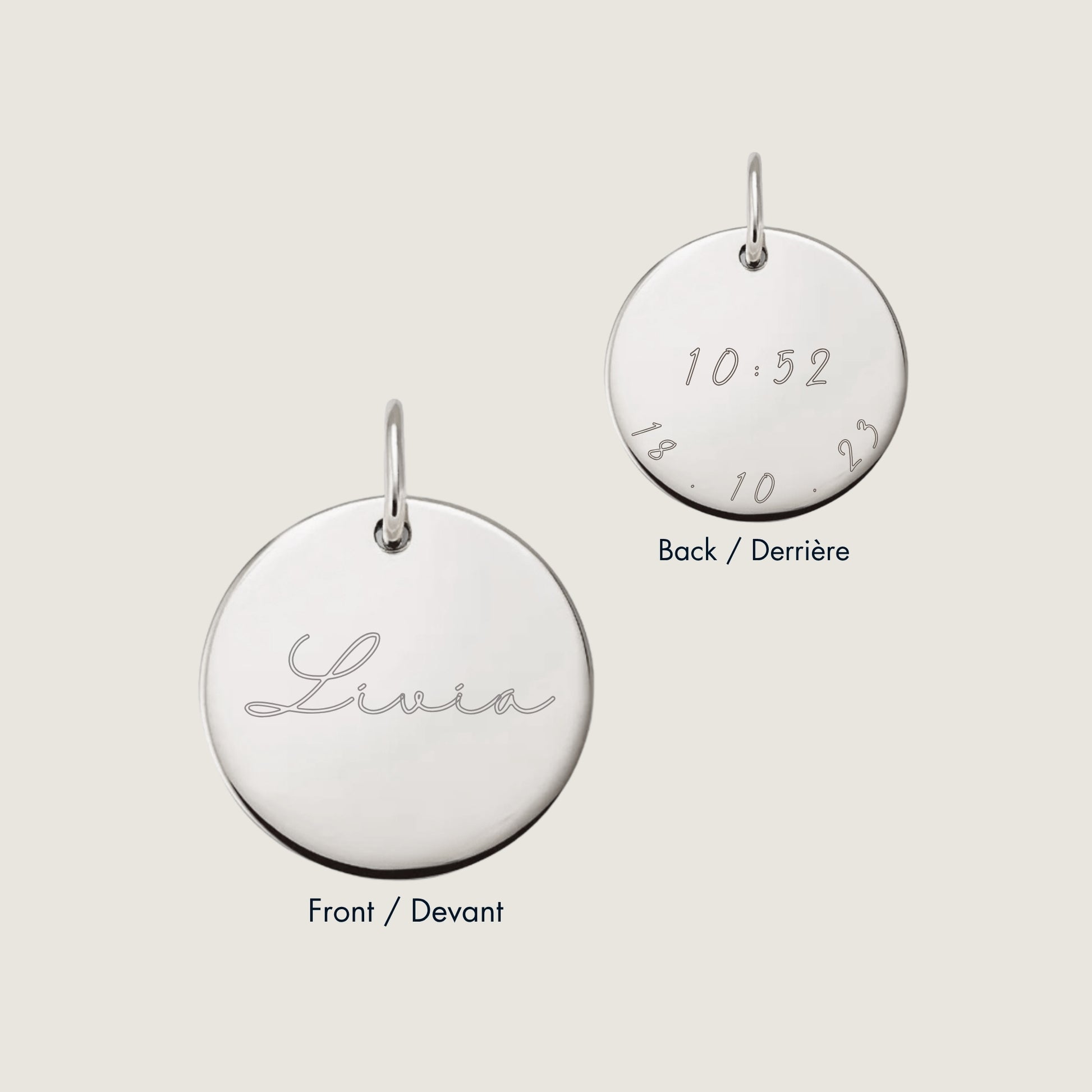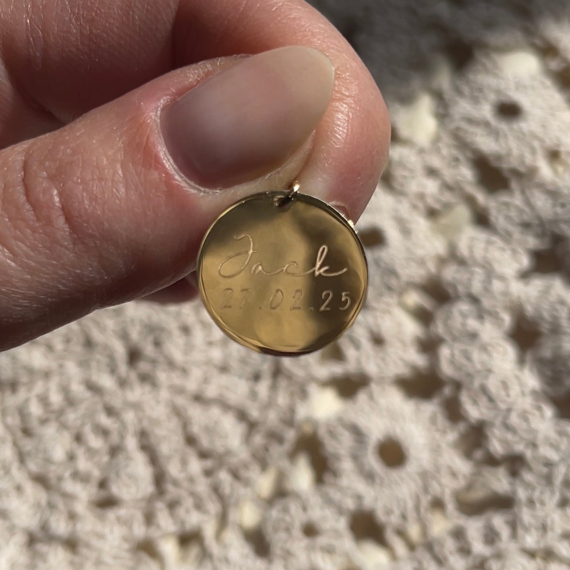 Our Custom Initial Name Pendant features a refined font engraving, carefully selected for its clean lines and timeless style. Whether you choose one initial, multiple, a name or add a special date, each piece is thoughtfully designed to represent a moment, a bond, or a memory. This custom pendant is laser-engraved for precision and clarity, allowing each initial to shine with elegance and simplicity. With its understated yet striking design, this piece is more than just jewelry—it’s a story you can wear every day.