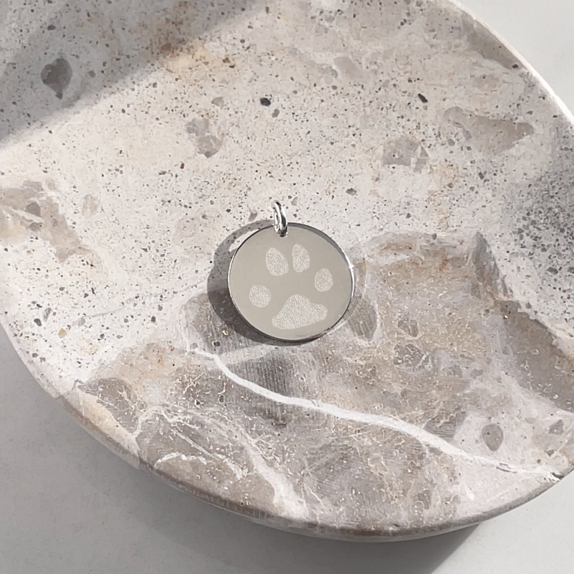 The Custom Paw Print Pendant features a stunning 925 Sterling Silver disk that radiates a rich and luxurious shine. The disk is sleek and can be paired perfectly with a dainty chain. Crafted in sterling silver, this Pendant is designed for daily wear—whether you’re dressing up or keeping it casual, it’s a versatile addition to any wardrobe.