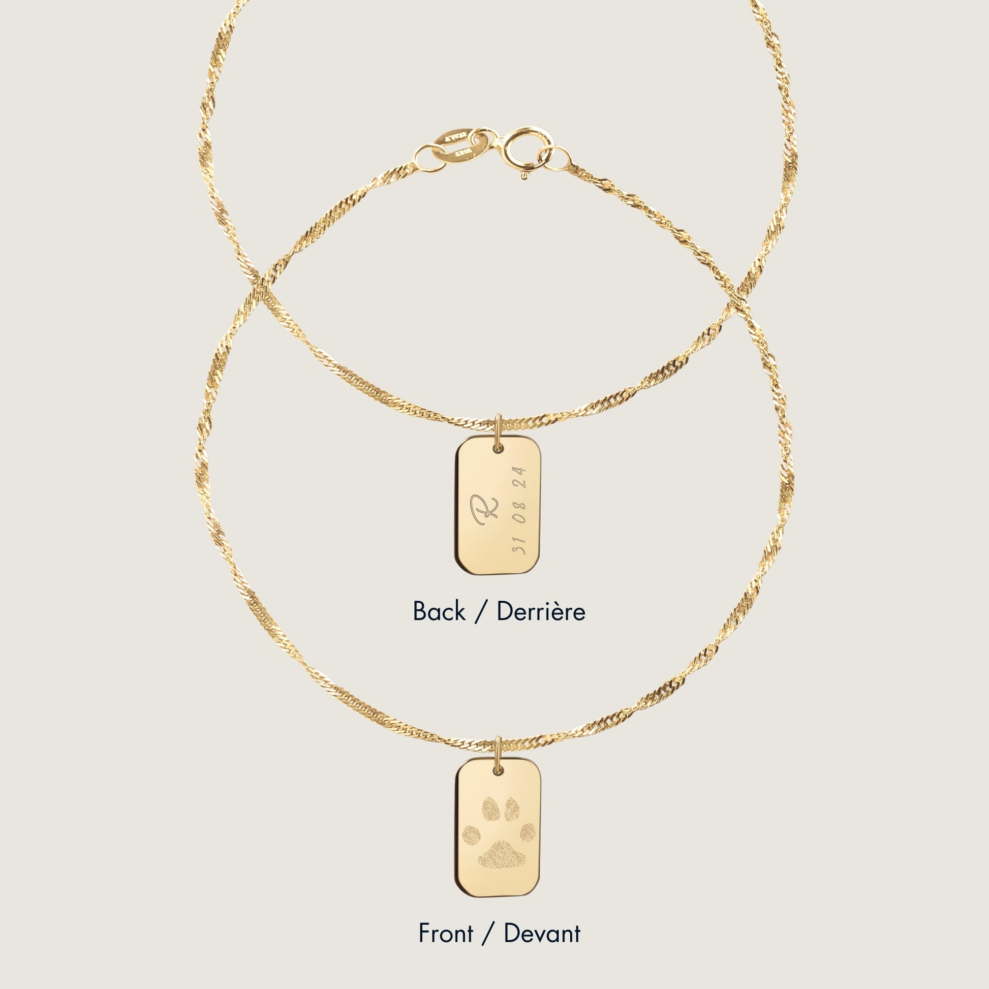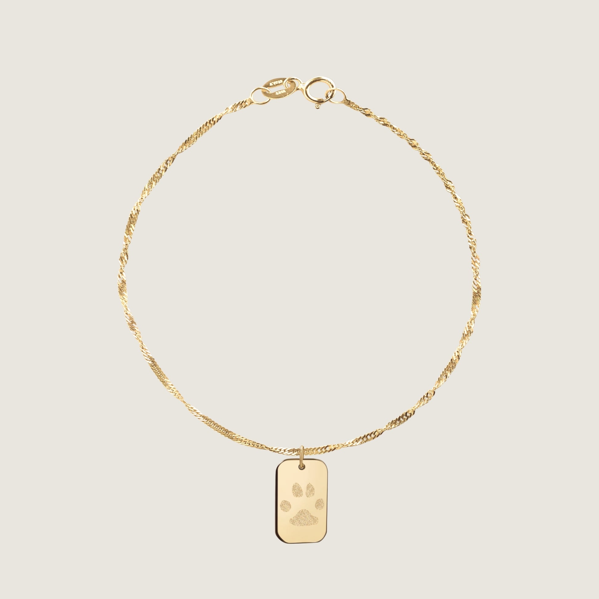The Custom Paw Print Twisted Bracelet features a stunning 10K solid gold disk that radiates a rich and luxurious shine. The disk is sleek is paired perfectly with  ou twisted singapore dainty chain. Crafted in solid gold, this bracelet is designed for daily wear—whether you’re dressing up or keeping it casual, it’s a versatile addition to any wardrobe.